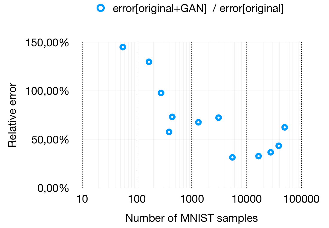 ). There seems to be a minimum amount of real samples after which the GAN starts to produce meaningful data.