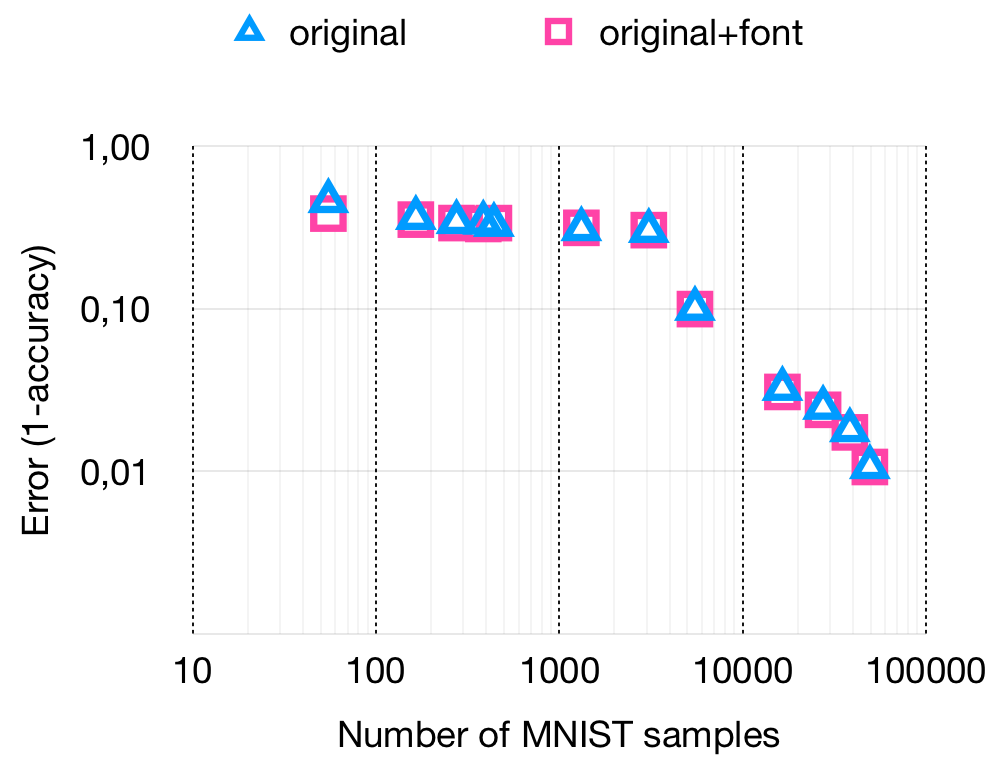 To confirm that the improved results of C-MNISToriginal+GAN can not be solely explained by the addition of the rendered font data, we compared C-MNISToriginal with C-MNISToriginal+font to see if the addition of font data increased the accuracy. From the results in figure 6 we had to conclude that C-MNISToriginal+font has performance roughly equal to C-MNISToriginal at the ratios where C-MNISToriginal+GAN is more accurate. The addition of more font data cannot explain the additional accuracy of C-MNISToriginal+GAN indicating this increase is a property of the transformation made by the GAN.