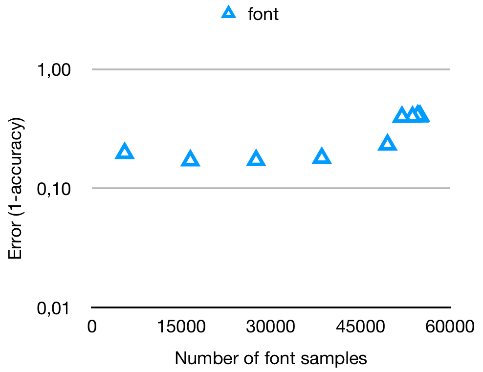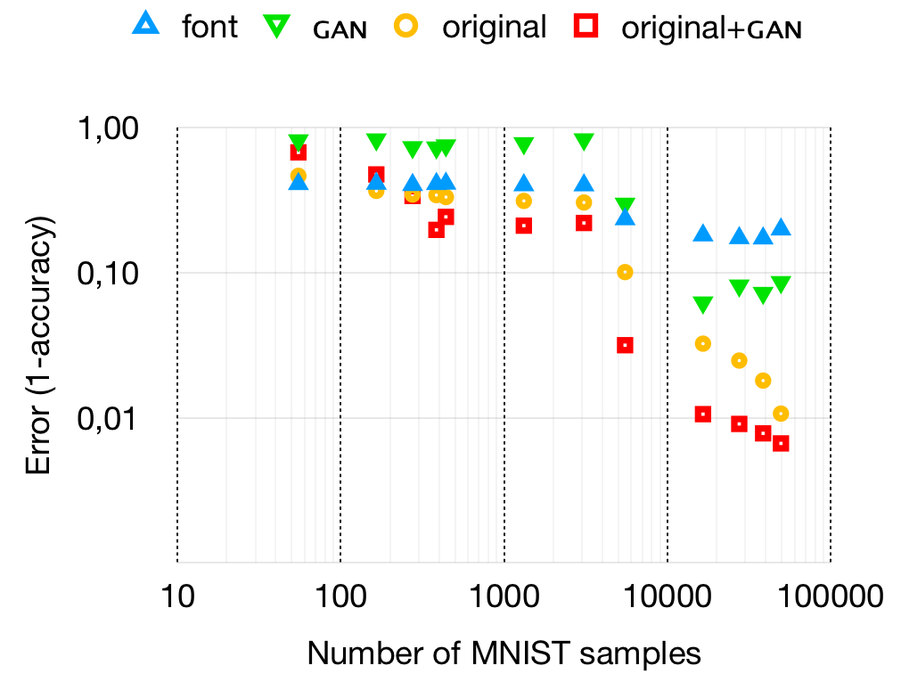 To make sure we actually test whether the GAN is able to close the distribution gap we looked at the accuracy of C-MNISTfont. For this dataset the error shows an inverse relation between the amount of samples and the performance of the classifier, which can be seen in figure 4. This indicates that a gap exists between the rendered font dataset and the MNIST test dataset.